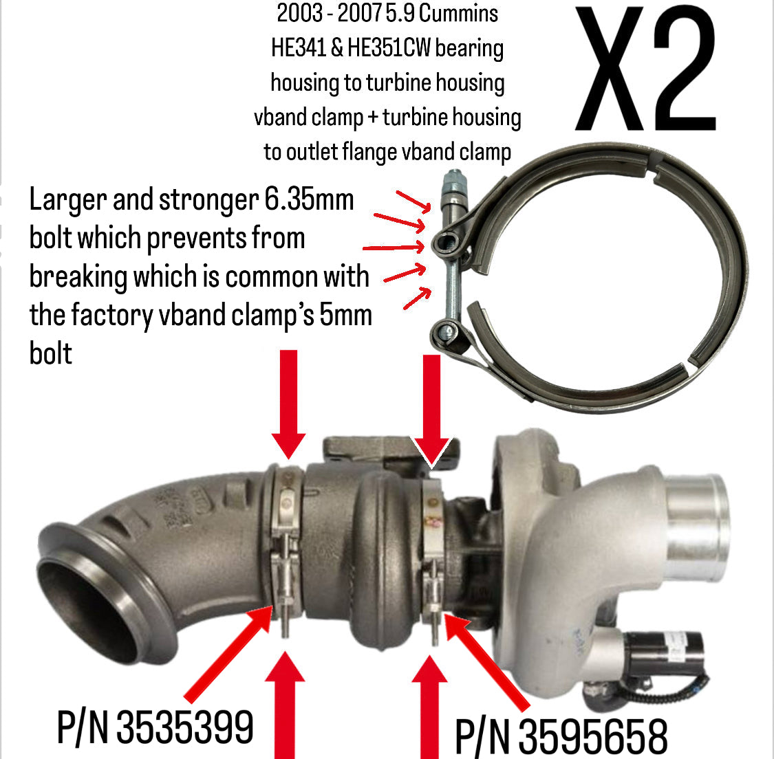 - These clamps fit 2004.5 - 2007 Dodge Ram 5.9 Cummins HE351CW turbo